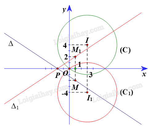 + Gọi \(({C_1})\) là ảnh của (C) qua \({Đ_{Ox}}\), khi đó (C1) có tâm I1 là ảnh của I(3; 4) \({Đ_{Ox}}\) và bán kính \({R_1}\; = {\rm{ }}R{\rm{ }} = {\rm{ }}5.\)
