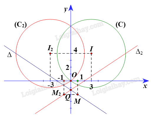 + Gọi \(({C_2})\) là ảnh của (C) qua \({Đ_{Oy}}\), khi đó \(({C_2})\) có tâm \({I_{2\;}}\) là ảnh của \(I\left( {3;{\rm{ }}4} \right)\)qua \({Đ_{Oy}}\) và bán kính \({R_2}\; = {\rm{ }}R{\rm{ }} = {\rm{ }}5.\)