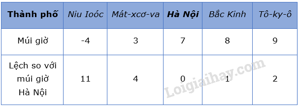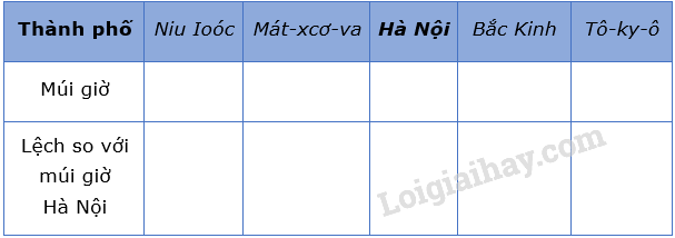Căn cứ vào hình 6.4 trong SGK, hãy điền múi giờ và số giờ lệch so với múi giờ Hà Nội của các thành phố trong bảng sau:
