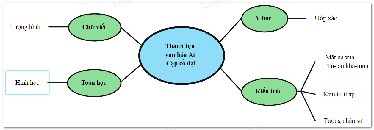 Vẽ sơ đồ tư duy theo mẫu bên dưới về các thành tựu văn hóa tiêu biểu mà người Ai Cập cổ đại đóng góp cho văn minh nhân loại.