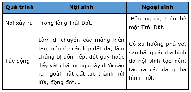 Dựa vào kiến thức đã học về quá trình nội sinh và quá trình ngoại sinh.