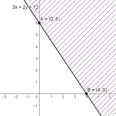 Vẽ đường thẳng \(d:3x + 2y = 12\) đi qua hai điểm \(A\left( {0;6} \right)\) và \(B\left( {4;0} \right)\)