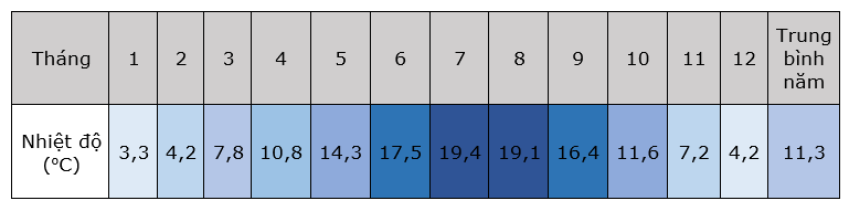 - Nhiệt độ trung bình tháng thấp nhất: 3,3oC (tháng 1).