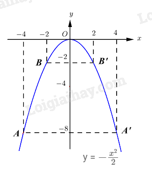 Đồ thị hàm số y = \( - \frac{{{x^2}}}{2}\) là một đường parabol đỉnh O đi qua các điểm A(-4;-8), B(-2;-2), O(0;0), B’(2;-2), A’(4;-8) như hình dưới.