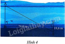 Do đó, $\Delta ABC\backsim \Delta FEC\left( g.g \right)$, suy ra \(\frac{{AB}}{{EF}} = \frac{{BC}}{{EC}}\), hay \(\frac{{AB}}{{18,6}} = \frac{{79,6}}{{34,2}}\), vậy \(AB = \frac{{79,6.18,6}}{{34,2}} \approx 43,3\left( m \right)\)