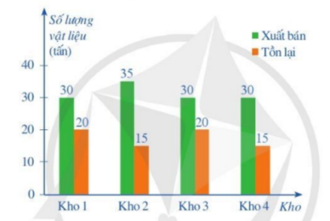 Một công ty kinh doanh vật liệu xây dựng có bốn kho hàng, mỗi kho hàng có 50 tấn hàng. Kế toán của công ty lập biểu đồ cột kép ở Hình 2 biểu diễn số lượng vật liệu đã xuất bán và số lượng vật liệu còn tồn lại trong mỗi kho sau tuần lễ kinh doạnh đầu tiên.