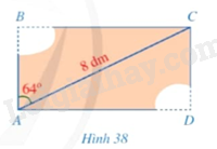Một mảnh gỗ có dạng hình chữ nhật (ABCD) với đường chéo (AC = 8dm). Do bảo quản không tốt nên mảnh gỗ bị hỏng phía hai đỉnh (B) và (D). Biết (widehat {BAD} = 64^circ ) (Hình 38). Người ta cần biết độ dài (AB) và (AD) để khôi phục mảnh gỗ ban đầu. Độ dài (AB,AD) bằng bao nhiêu decimét (làm tròn kết quả đến hàng phần mười)?