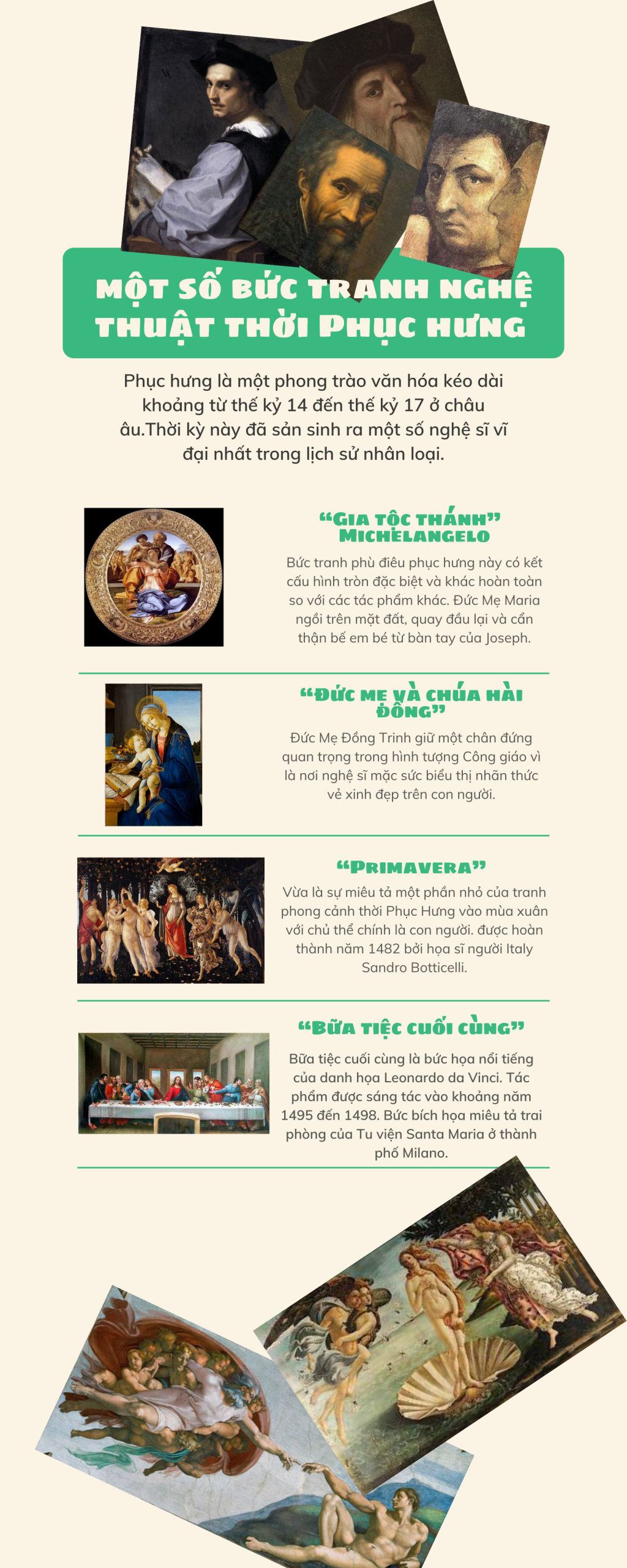 Sưu tầm một số bức tranh nghệ thuật thời Phục hưng và sắp xếp thành một bộ sưu tập nhỏ. Ở mỗi bức tranh, hãy viết chú thích về nội dung tác phẩm.