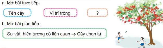 Mở bài gián tiếp Nêu các sự vật, hiện tượng có liên quan để dẫn vào giới thiệu cây: – Liệt kê nhiều loại cây giới thiệu cây chọn tả. – Giới thiệu một người, vật,... gợi nhớ đến cây. – Giới thiệu một bài thơ, bài hát,... có nhắc đến tên cây. – ? |