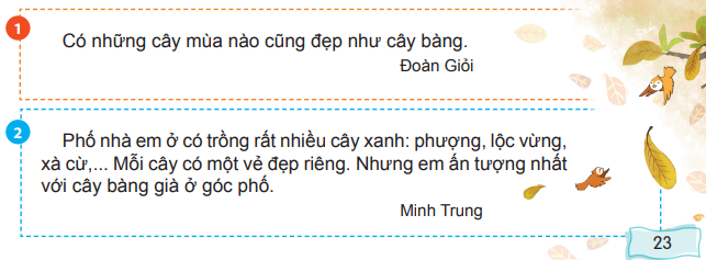b. Sân trường em trồng rất nhiều loại cây cho bóng mát. Chúng đứng thành hàng thẳng tắp, xòe tán rộng che bóng mát khắp cả sân trường. Nhưng có lẽ gốc cây thu hút nhiều nhất vẫn là cây phượng già ở giữa sân trường.