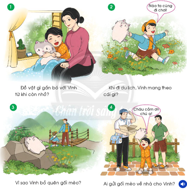 Quan sát tranh và trả lời câu hỏi dưới tranh. Kể lại từng đoạn câu chuyện theo tranh. Vinh và chiếc gối mèo. Vinh có một chiếc gối mèo mà cậu rất quý.