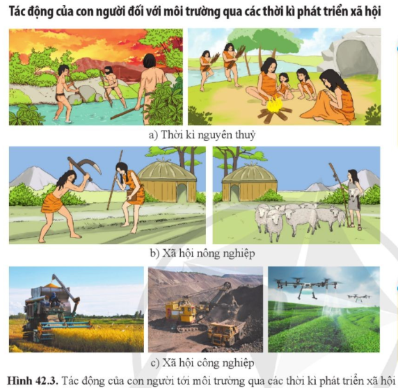 Quan sát hình 42.3 và cho biết con người đã tác động đến môi trường qua các thời kì bằng những cách nào.