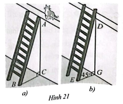 Để lao lên một bức tường, bác Dũng dùng một chiếc thang cao hơn bức tường đó 2m. Ban đầu bác Dũng đạt chiếc thang mà đầu trên của chiếc thang đó vừa chạm đúng vào mép trên của bức tường (Hình 21a). Sau đó bác Dũng dịch chuyển chân thang vào gần chân bức tường thêm 1 m thì bác Dũng thấy thang tạo với mặt đất một góc \({45^ \circ }\). Bức tường cao bao nhiêu mét?
