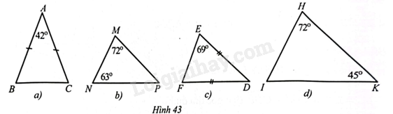 Ta có: \(\Delta ABC\) có \(\widehat A = 42^\circ ,\widehat B = \widehat C = \left( {180^\circ - 42^\circ } \right):2 = 69^\circ \)