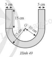 Hình 49 mô tả mặt cắt của một chi tiết máy ép nhựa có dạng ở giữa là nửa hình vành khuyên giới hạn bởi hai nửa đường tròn (O; 15 cm), (O; 10 cm) và hai đầu là hai hình chữ nhật có chiều dài 15 cm, chiều rộng 5 cm. Tính diện tích mặt cắt của chi tiết máy ép nhựa đó (làm tròn kết quả đến hàng phần trăm của centimét vuông).