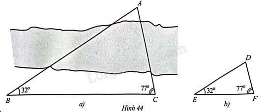 Chứng minh rằng: Nếu thực hiện vẽ trên giấy một tam giác \(DEF\) sao cho \(EF = 10\) (cm), \(\widehat {DEF} = 32^\circ ,\widehat {DFE} = 77^\circ \) (Hình 44b); Đo độ dài đoạn \(DF\) và giả sử \(DF = a\) (cm) thì độ dài \(AC\) mà bác An cần đo là \(2a\) (m).