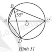 Cho các điểm A, B, C, D thuộc đường tròn tâm O đường kính \(AC = 2\)cm với \(\widehat {CBD} = 55^\circ \) (Hình 51)