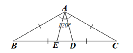 Cho tam giác ABC cân tại A có \(\widehat {BAC} = 120^\circ \) Trên cạnh BC lấy các điểm D, E sao cho BD = BA, CE = CA.