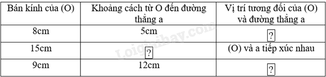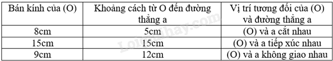 Cho đường tròn (O; R) và đường thẳng a. Đặt d là khoảng cách từ O đến đường thẳng a. Vị trí tương đối của đường thẳng a và đường tròn (O; R) có thể được xác định dựa vào mối quan hệ giữa R và d như sau: