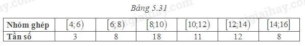 Nhóm chứa mốt là \(\left[ {8;10} \right)\) với tần số là 18. Khi đó, \({L_m} = 8;h = 10 - 8 = 2\)