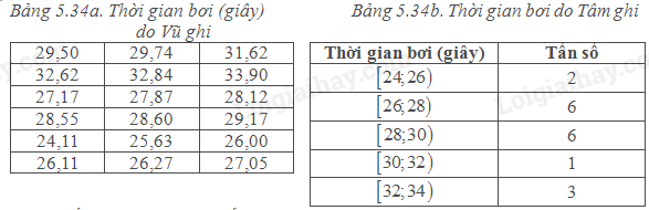 Vũ và Tâm đều theo dõi thành tích của các vận động viên nam trong một cuộc thi bơi tự do dài 50 m. Vũ ghi lại thời gian bơi (đơn vị: giây) của mỗi vận động viên, còn Tâm lập bảng phân bố tần số ghép lớp để biểu diễn kết quả.