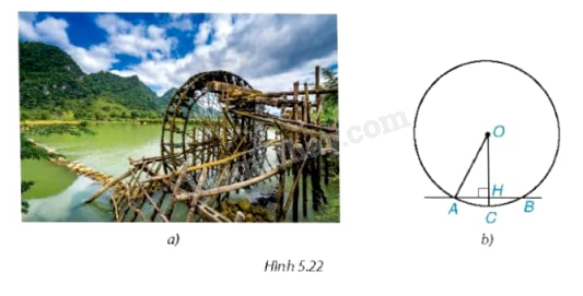 Giả sử ngấn nước ngăn cách giữa phần trên và phần dưới của một guồng nước được biểu thị bởi cung ứng với một dây dài 4 m và điểm ngập sâu nhất là 0,5 m (trên hình 5.22b, điểm ngập sâu nhất là điểm C, ta có AB = 4 m và HC = 0, 5 m). Dựa vào đó, em hãy tính bán kính của guồng nước.