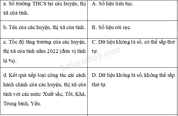 d ‒ C: Kết quả xếp loại công tác cải cách hành chính của các huyện, thị xã của tỉnh với các mức: Xuất sắc, Tốt, Khá, Trung bình, Yếu là dữ liệu không là số, có thể sắp thứ tự.