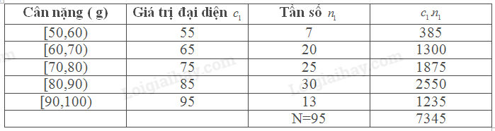 Cân nặng trung bình của cá nuôi ở cơ sở A là: \(\mathop {{x_A}}\limits^\_ = \frac{{7345}}{{95}} = 77,31\) (g)