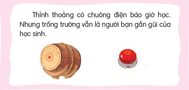 Bài đọc kể về bác trống trường, giúp học trò vào lớp đúng giờ. Dù có anh chuông điện mới, bác trống vẫn là người bạn thân thiết của các em học sinh. |