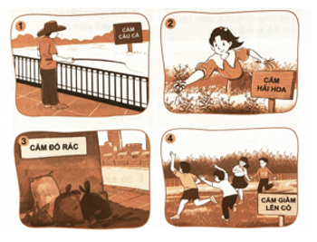 - Tranh 4: Có biển cấm giẫm lên cỏ nhưng các bạn nhỏ vẫn giẫm lên cỏ chơi đá bóng.