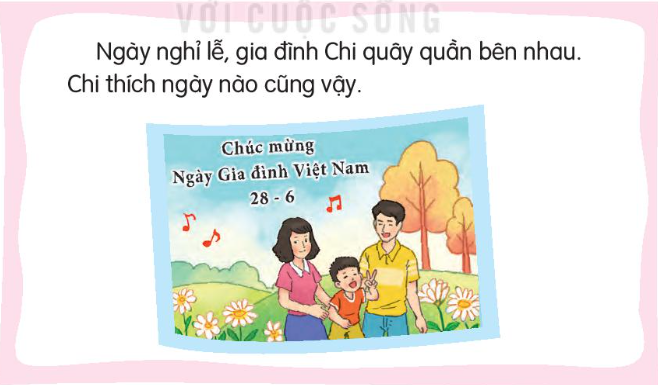 Chi vui lắm. Em nhặt rau giúp mẹ. Bố dọn nhà, rửa xoong nồi, cốc chén. Ông bà trông em bé để mẹ nấu ăn. Cả nhà quây quần bên nhau. Bữa cơm thật tuyệt. Chi thích ngày nào cũng là ngày Gia đình Việt Nam.