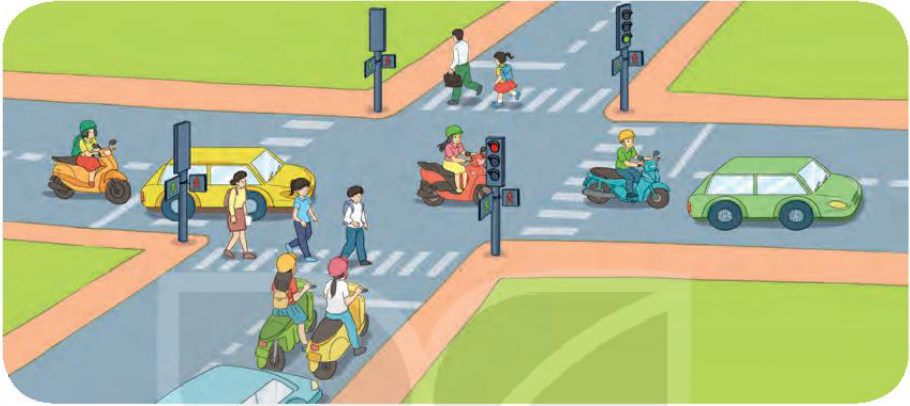 - Chỉ được qua đường khi có đèn xanh ở biển báo dành cho người đi bộ.