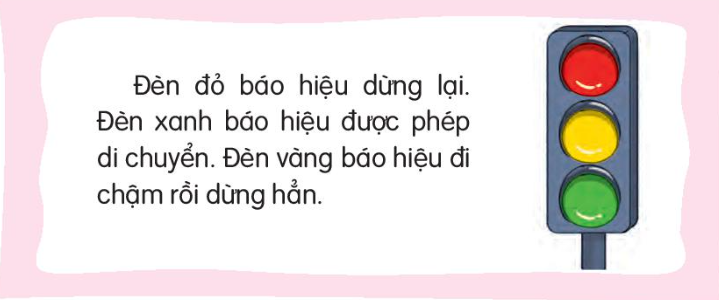 Bài đọc giải thích về đèn giao thông với ba màu: đỏ (dừng), vàng (chậm lại), xanh (di chuyển), giúp điều khiển giao thông và bảo đảm an toàn. |
