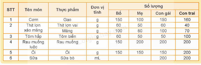 Tính toán chi phí một bữa cơm gia đình có bốn thành viên gồm: bố (50 tuổi), mẹ (45 tuổi), con gái (18 tuổi), con trai (12 tuổi) với thực đơn một bữa ăn như sau:
