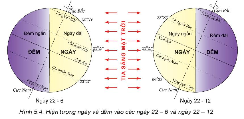 Khi Trái Đất chuyển động quay quanh Mặt Trời, trục Trái Đất luôn nghiêng một góc 66o33’ không đổi, hai bán cầu Bắc, Nam sẽ lần lượt ngả về phía Mặt Trời. Do đường phân chia sáng tối không trùng với trục của Trái Đất. Nên bán cầu nào ngả về phía Mặt Trời nhiều hơn sẽ có thời gian ban ngày dài hơn ban đêm.