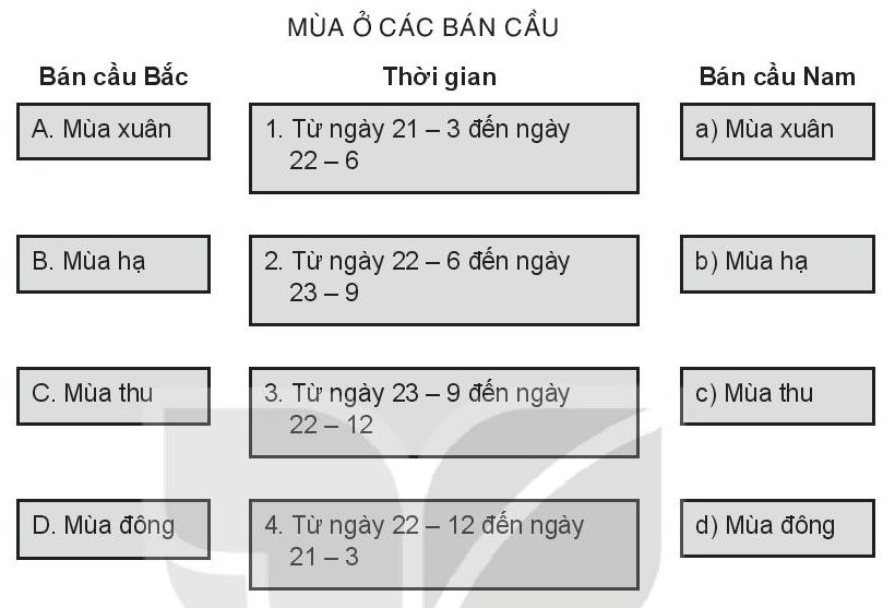 Đọc lại kiến thức về các mùa trong năm trong mục 2 trang 19 – 20 SGK địa lí 10. Mùa ở 2 bán cầu có thời gian trái ngược nhau