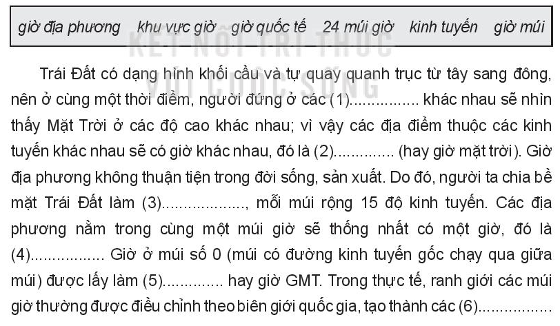 - Địa điểm nằm trên các kinh tuyến khác nhau có giờ địa phương khác nhau vì: Trái Đất có dạng hình khối cầu và tự quay quanh trục từ tây sang đông