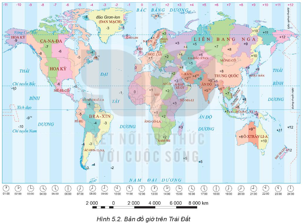 Quan sát 5.2 SGK trang 18 để xác định múi giờ các thành phố trên, giờ của các thành phố sẽ bằng giờ của Hà Nội cộng với hiệu số số múi giờ giữa 2 điểm