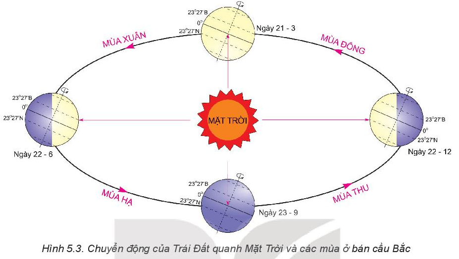 Quan sát hình 5.3 SGK trang 19, dựa và hướng nghiêng của Trái Đất về phía Mặt trời ở các ngày để giải thích