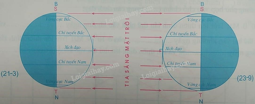 Ngày 21/3 và ngày 23/9 không có bán cầu nào chúc về phía Mặt Trời nên đường phân chia sáng tối trùng với trục Trái Đất, vì vậy ở mọi nơi có ngày và đêm dài bằng nhau.