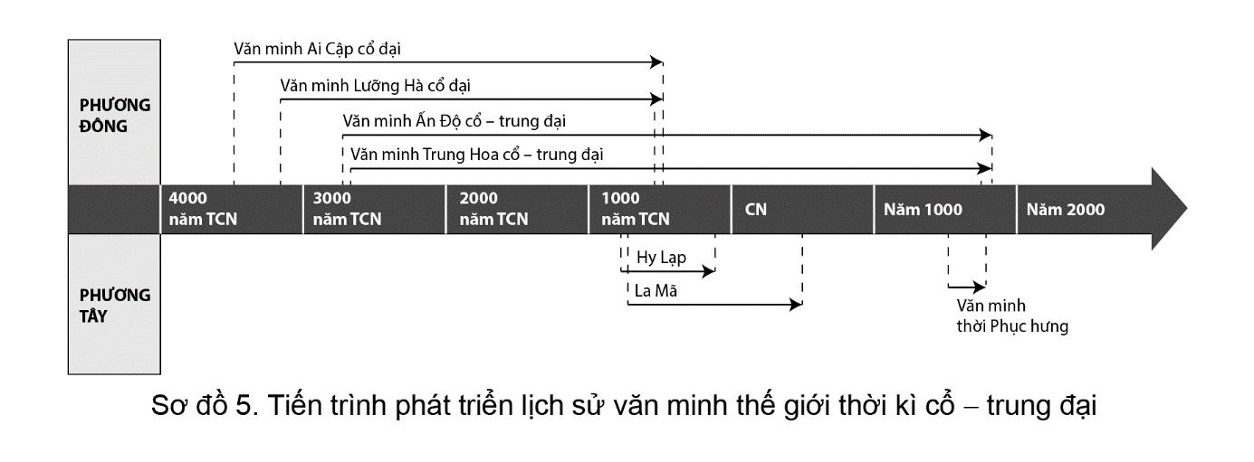Từ sơ đồ 5 ta có thể thấy nền văn minh phát triển liên tục từ thời cổ đại đến trung đại là các nền văn minh Ấn Độ và văn minh Trung Hoa