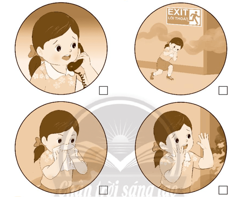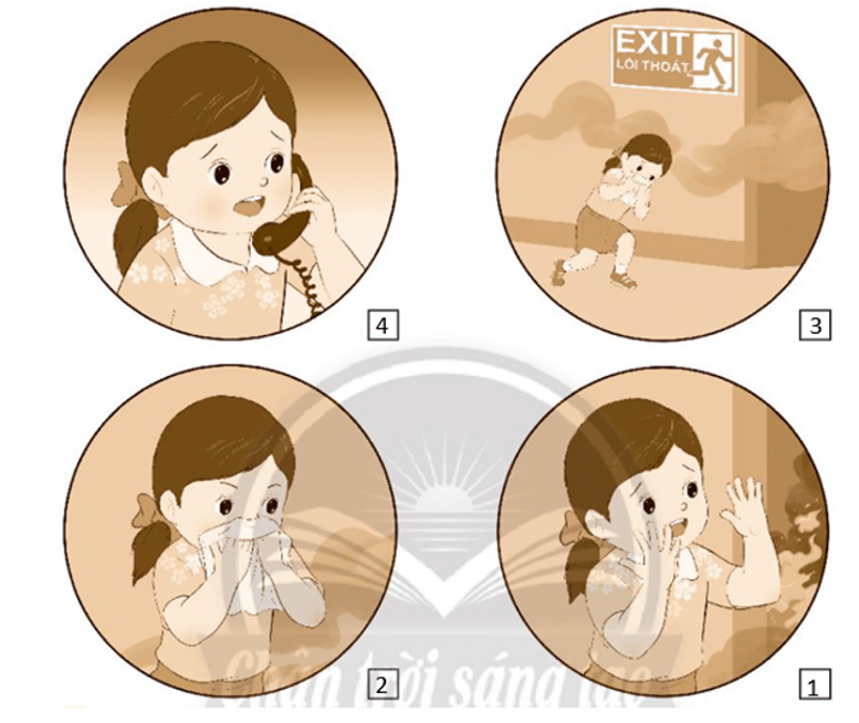 Đánh số 1 đến 4 vào ô trống bên cạnh mỗi hình để chỉ thứ tự phù hợp với các bước thoát khỏi hoả hoạn khi có cháy xảy ra.