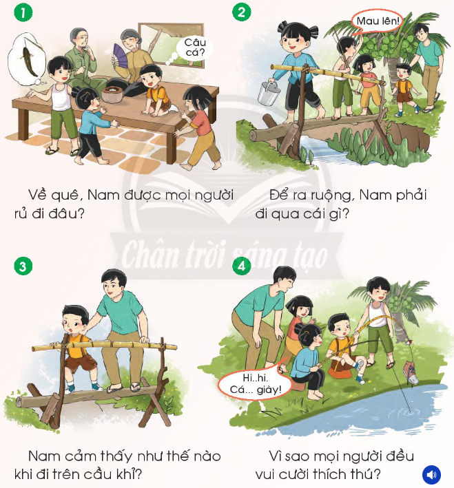- Tranh 1: Về quê, Nam được mọi người rủ đi câu cua.