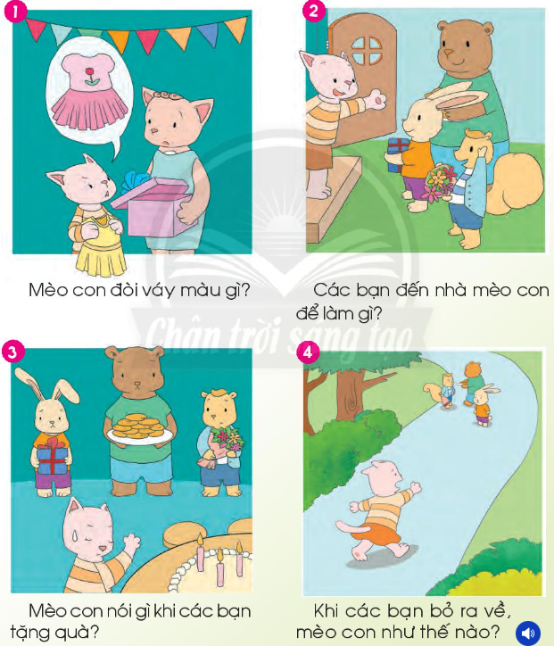 - Tranh 2: Các bạn đến nhà mèo con để dự tiệc sinh nhật mèo con.