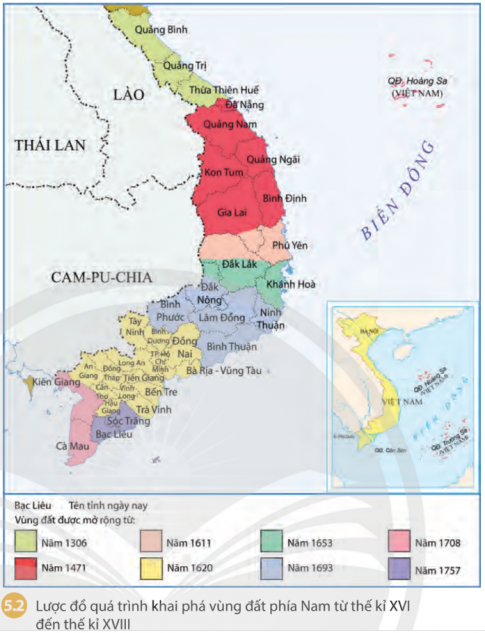 Dựa vào thông tin trong bài và lược đồ 5.2, em hãy cho biết quá trình khai phá vùng đất phía Nam từ thế kỉ XVI đến thế kỉ XVIII đã diễn ra như thế nào.