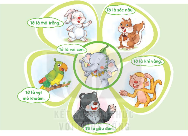 Quan sát tranh và nói về từng con vật trong tranh. Đọc. Trả lời câu hỏi. Viết vào vở câu trả lời cho câu hỏi b ở mục 3. Chọn từ ngữ để hoàn thiện câu và viết câu vào vở. Quan sát tranh và dùng từ ngữ trong khung để nói theo tranh. Nghe viết. Tìm trong hoặc ngoài bài đọc Sinh nhật của voi con từ ngữ có tiếng chứa vần oăc, oac, uơ. Nói lời chúc mừng sinh nhật một người bạn của em.