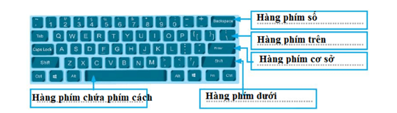 a) Khu vực chính của bàn phím: hàng phím số, hàng phím trên, hàng phím cơ sở, hàng phím dưới và hàng phím chứa dấu cách.