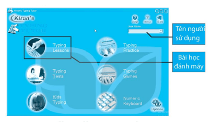 Hãy khởi động phần mềm Kiran’s Typing Tutor, đặt tay đúng cách trên bàn phím, nhập tên và chọn mục Typing Lessons để học tập đánh máy.