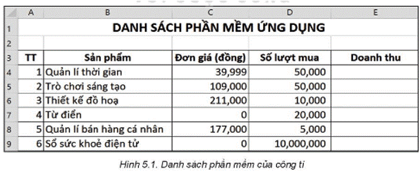 Bố của Khoa là giám đốc một công ti sản xuất phần mềm máy tính. Bố là người truyền cho Khoa niềm đam mê tin học. Trong kì nghỉ hè vừa qua, để ôn lại kiến thức và tìm hiểu thêm về phần mềm bảng tính, bố giao cho Khoa tính toán doanh thu một số phần mềm mà công ti của bố sản xuất. Những phần mềm này được đưa lên các chợ ứng dụng trên mạng. Người sử dụng truy cập vào các chợ ứng dụng tìm kiếm phần mềm mà mình cần để mua và cài đặt. Tuỳ theo từng phần mềm, người sử dụng có thể phải trả phí hoặc được miễn phí. Để hoàn thành việc bố giao, Khoa đã tạo bảng tính để lưu thông tin về các phần mềm như minh hoạ trong Hình 51.