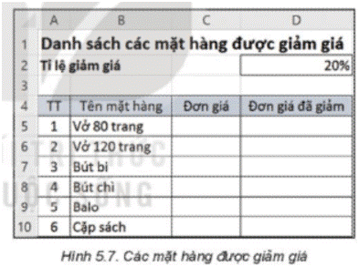 Nhân dịp khai giảng năm học mới, tại một số cửa hàng, nhà sách,… các mặt hàng đồ dùng học tập được giảm giá. Danh sách một số mặt hàng được giảm giá và tỉ lệ giảm giá được lưu ở ô D2 như trong Hình 5.7